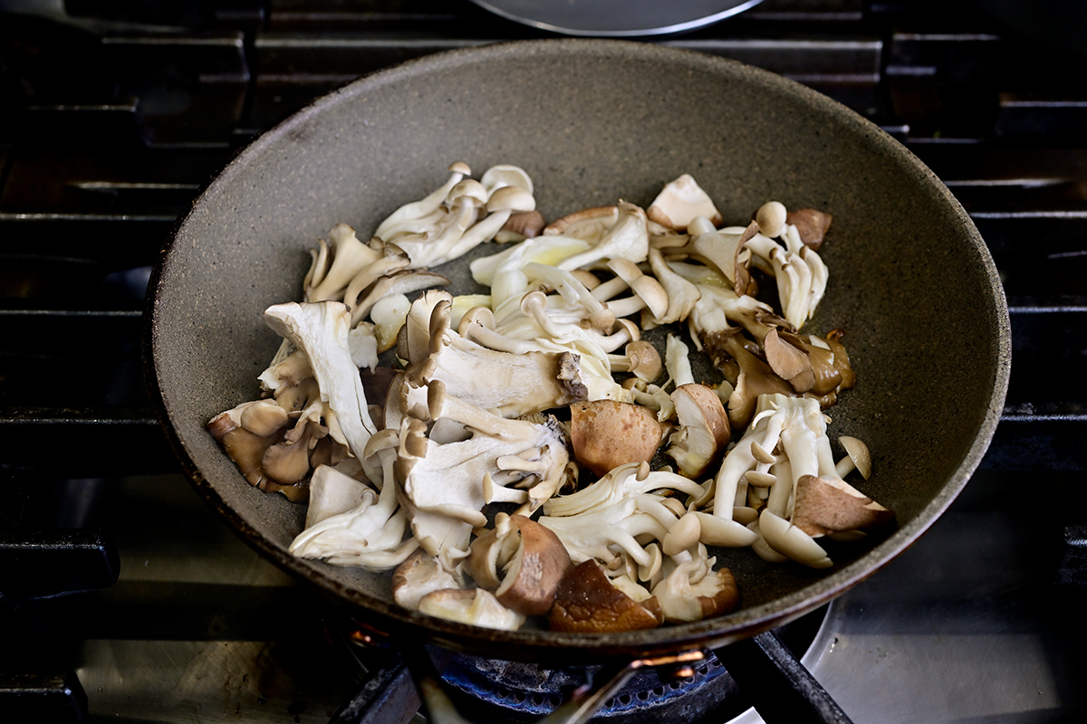 「バターフレーバーオイル」とキノコを加え、あまり動かさずに焼きつけてから蒸すことで素材の風味を最大化。