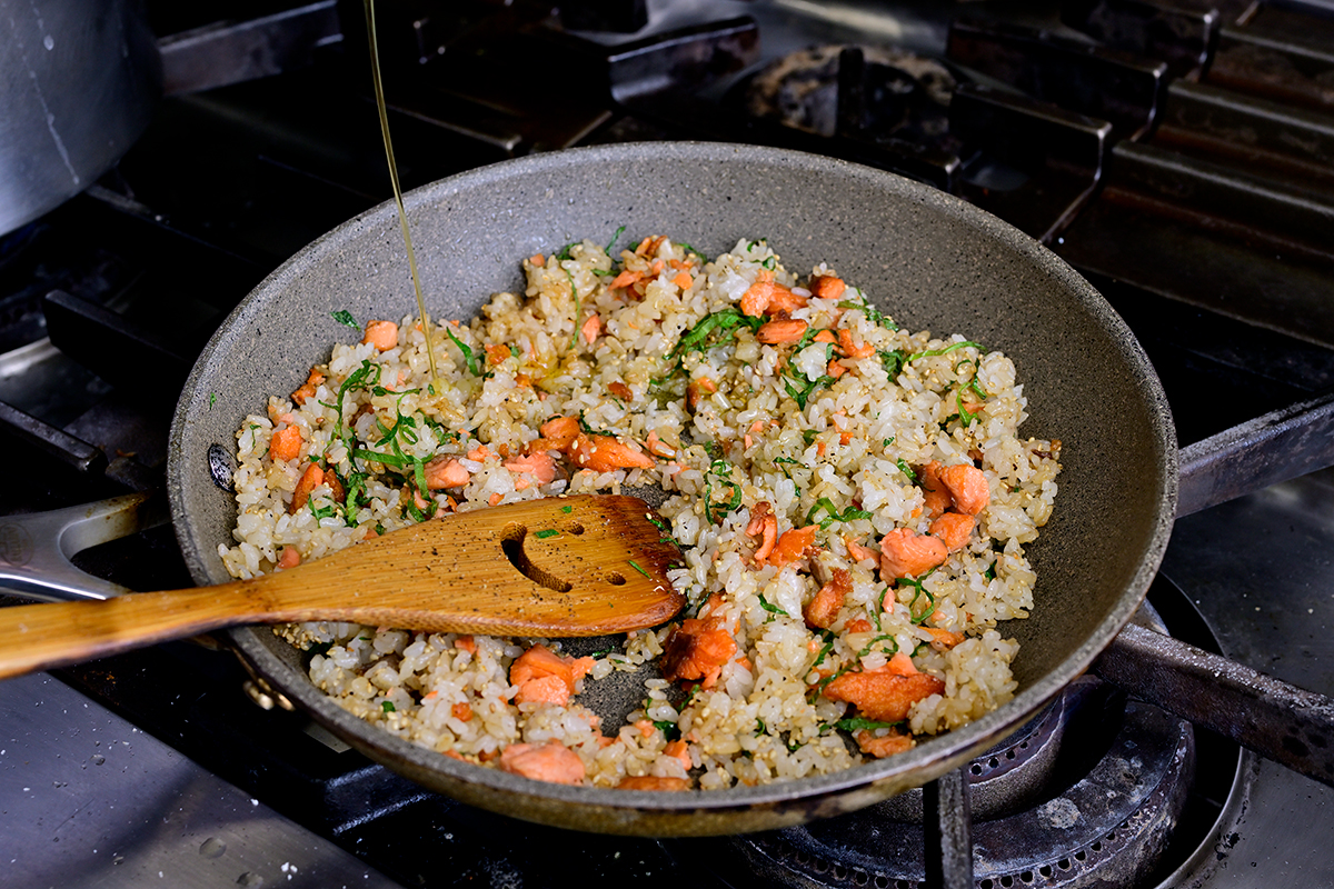 焼いてほぐした鮭を「バターフレーバーオイル」で先に炒めることで、具材にしっかりと味がつき、香ばしい風味もアップ。