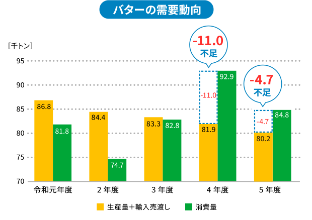 バターの原料となる生乳の国内生産量の減少や飼料価格の高騰等により、バターの供給不安や価格上昇が懸念され続けています。しかしバターフレーバーオイルは、供給不安の心配が少なく、価格もバターよりリーズナブルなので、継続的に安心してご使用いただけます。