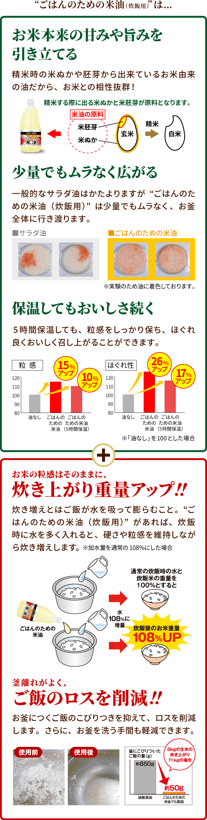 “ごはんのための米油”を使うと、ごはんのツヤ・テリも良くなり、お米の甘みや旨みの余韻が残る印象です。さらに、釜離れが良くなり、釜にくっつく部分も減り、ロスが削減できますね。お米本来の美味しさに重ねて、コストダウンも図れますね※。